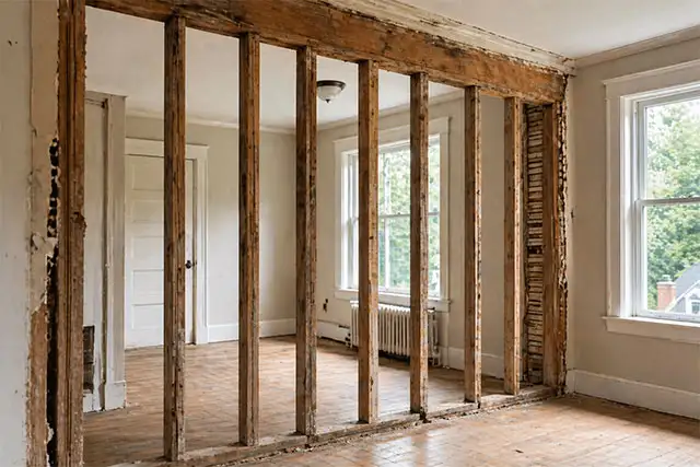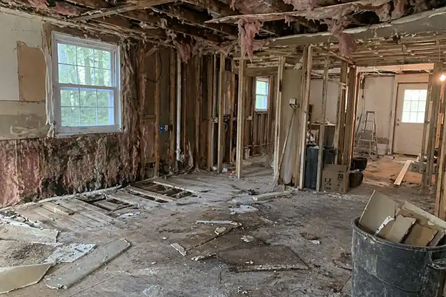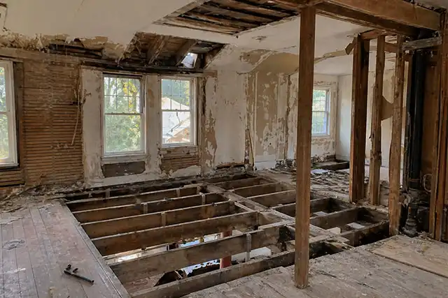 Moisture can weaken framing, compromise subfloors, and affect structural connections. Even after drying is complete, structural damage often remains and requires full reconstruction of affected components rather than partial repair.